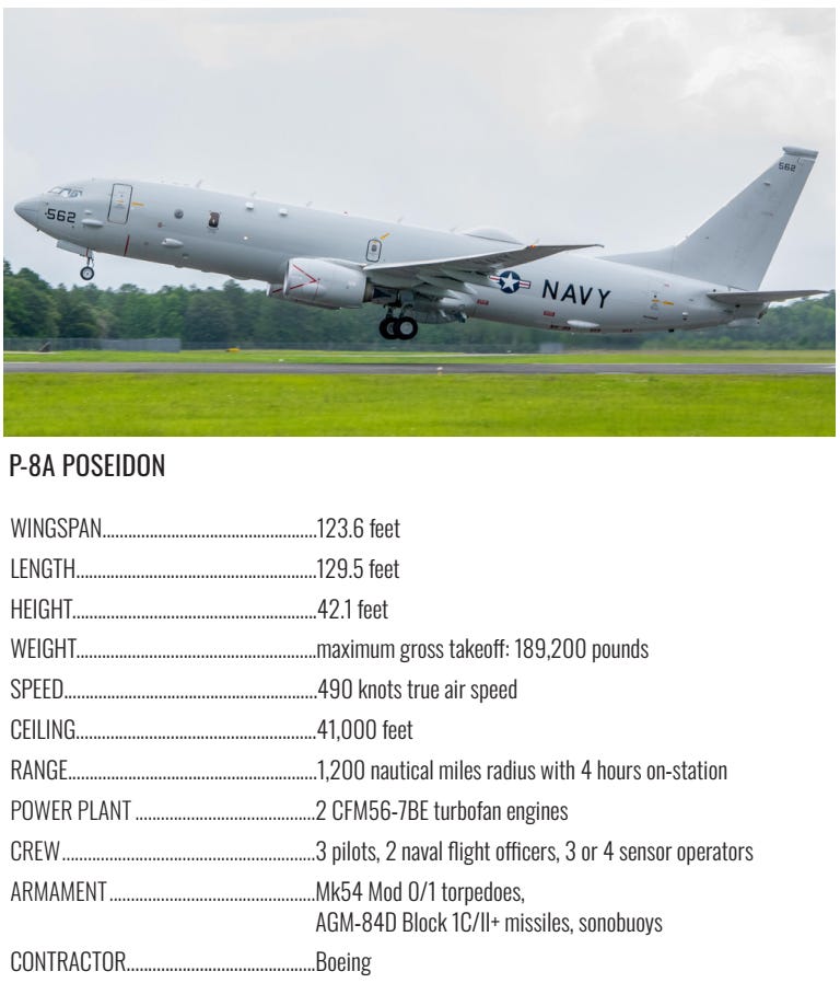 Potrivit NAVAIR (“aeronavala”, componenta aeriană a US Navy), “P-8A Poseidon este un avion multi-rol de patrulare și cercetare maritimă al Marinei Militare americane, înlocuitor al vechiului P-3C Orion, capabil să execute misiuni de luptă anti-submarin (anti-submarine warfare ASW), luptă împotriva navelor de suprafață și ISR (intelligence, surveillance and reconnaissance) la distanțe mari”.