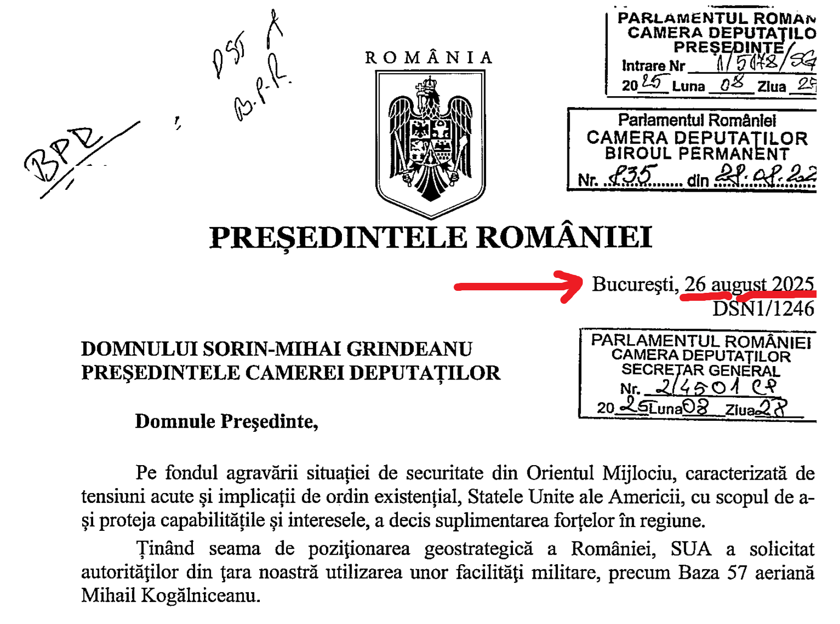 Nicuşor Dan informa Parlamentul României că „a aprobat prepoziţionarea pe teritoriul României a unor aeronave de realimentare în aer, a unui contingent al Statelor Unite ale Americii şi mijloace de protecţia forţei, precum şi a unor aeronave ISR (Intelligence Surveillance and Reconessaince) şi de supraveghere aeriană la Baza 57 aeriană Mihail Kogălniceanu, în vederea sprijinirii eventualelor operaţii viitoare”.
