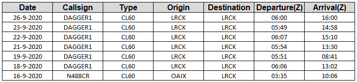 Lista primelor zboruri ale aeronavei N488CR, imediat după sosirea în România. LRCK - cod ICAO pentru Aeroportul Mihail Kogălniceanu. Sursa: anonim via The Aviationist (link)