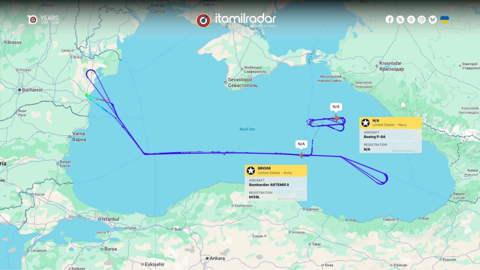 29 ianuarie 2026 Itamilradar, site italian de limbă engleză specializat în tracking aerian în Mediterana și zona învecinată, identifica traseul parcurs deasupra Pontului Euxin de două avioane de supraveghere (link). Deși nu e prima oară când sunt detectate astfel de zboruri, remarcabilă în acest caz e îndrazneala cu care s-a pătruns în estul Mării Negre. Practic până în curtea Rusiei, aproape de Novorosiisk. Cele două aeronave ISR și de supraveghere aeriană identificate sunt un Bombardier Challenger 650 ARTEMIS și un P-8A Poseidon.