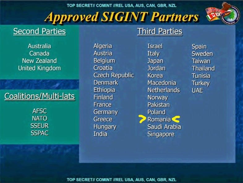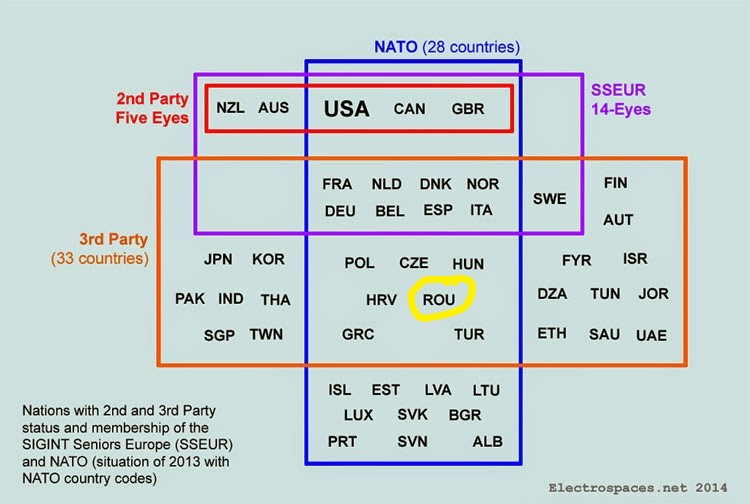 … dar e bine să știm că SUA, intelligence-ul american, își împarte aliații în mai multe categorii - pe “ranguri” de alianță. În funcție de rangul acordat unei țări, se fac sau nu se fac anumite lucruri, cu sau împotriva acesteia. De exemplu, cu statele “second parties” se colaborează cel mai strâns iar împotriva acestora nu se desfățoară acțiuni de spionaj (de niciun fel, nici COMINT).