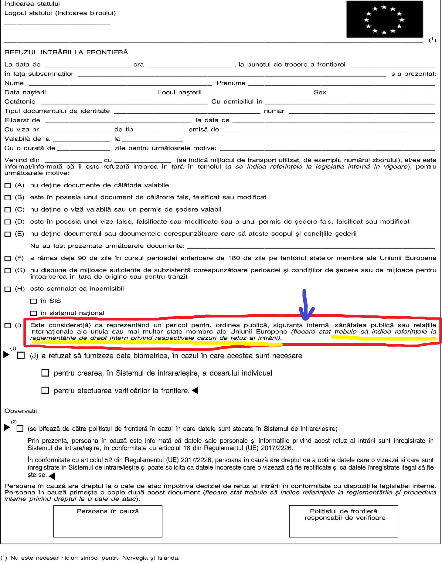 Pasul 3: “Măsura nepermiterii intrării în România se motivează de către organele poliției de frontieră și se comunică imediat persoanei în cauză, utilizând formularul prevăzut în partea B din anexa V la Codul frontierelor Schengen, precum și Centrului Național de Vize din cadrul Ministerului Afacerilor Externe” ( art. 8 alin (4)).