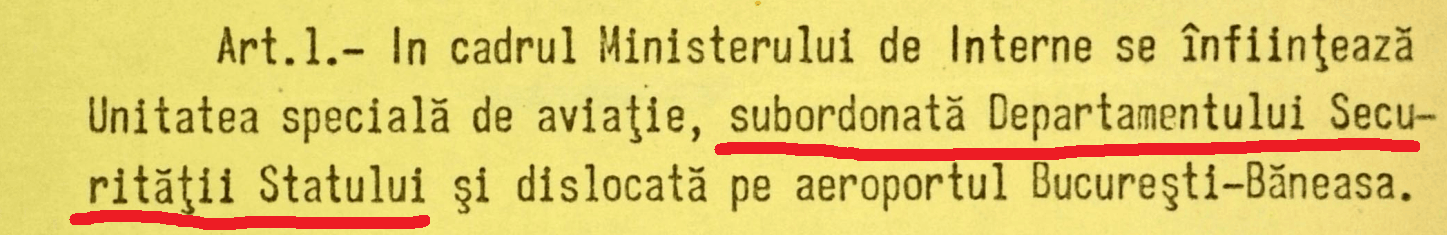 Extras din Decretul nr. 289 din 01.08.1978 privind înfiinţarea Unităţii Speciale de Aviaţie în cadrul Ministerului de Interne (Sursa CNSAS)