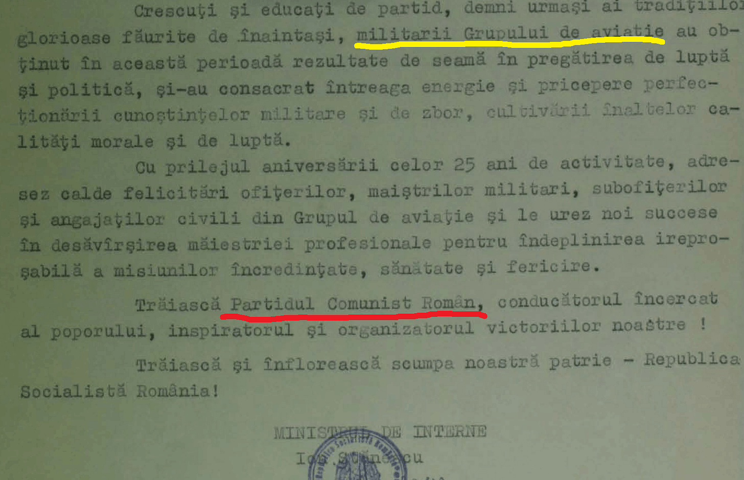 Mostră de ideologizare politică a cadrelor militare: extras din Ordinul M.I. nr. 196 din 25.12.1972 privind aniversarea a 25 de ani de activitate a Grupului de aviaţie. “Crescuți și educați de partid …” sau Partidul mai presus de Patrie. Sursa: CNSAS
