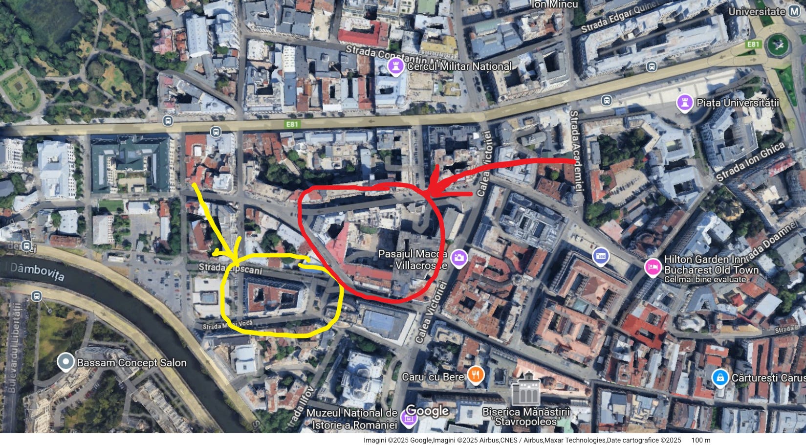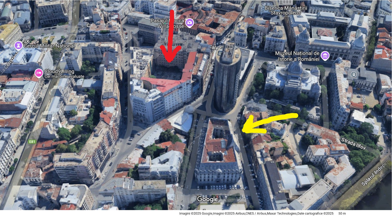 Sediul MI (săgeată galbenă) și sediul central al Securității (săgeată roșie). Vedere dinspre vest.